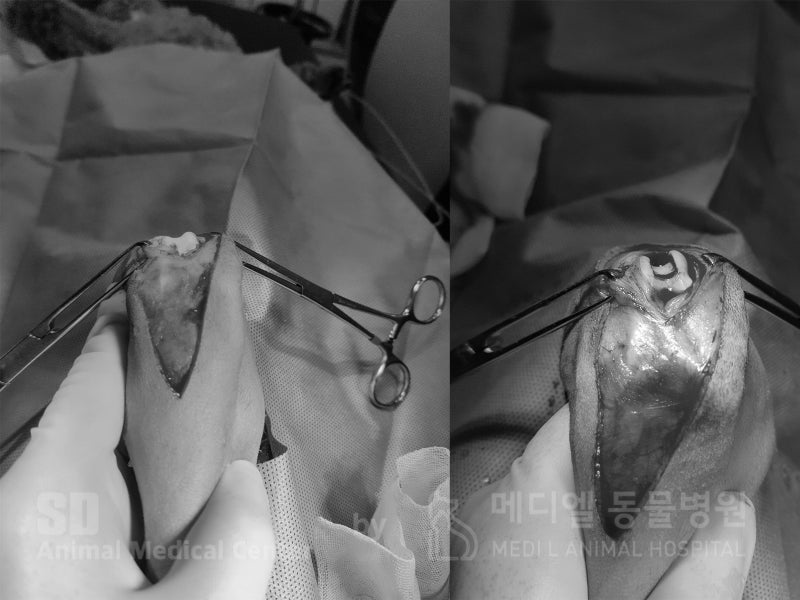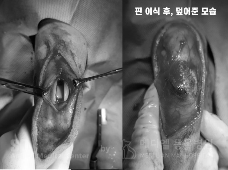 슬개골 탈구 수술을 진행하였고, 더 이상 슬개골이 미끄러져 빠지지 않게 얕게 있던 고랑을 깊게 파주었습니다.