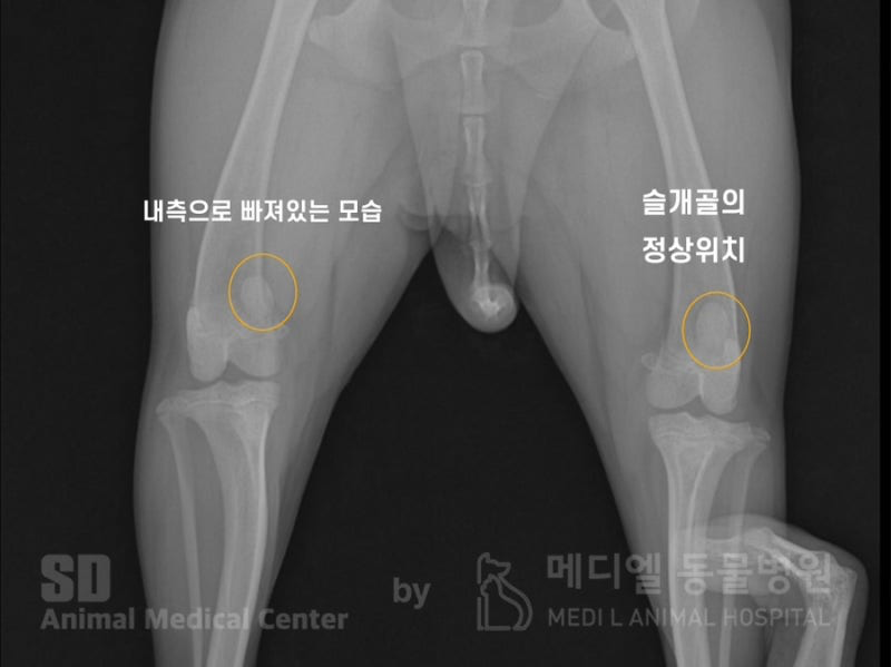 해당 환자의 방사선 사진입니다. 우측다리의 슬개골은 내측으로 빠져있는 것이 확인되며, 좌측 다리의 슬개골은 정상위치에서 확인됩니다.
