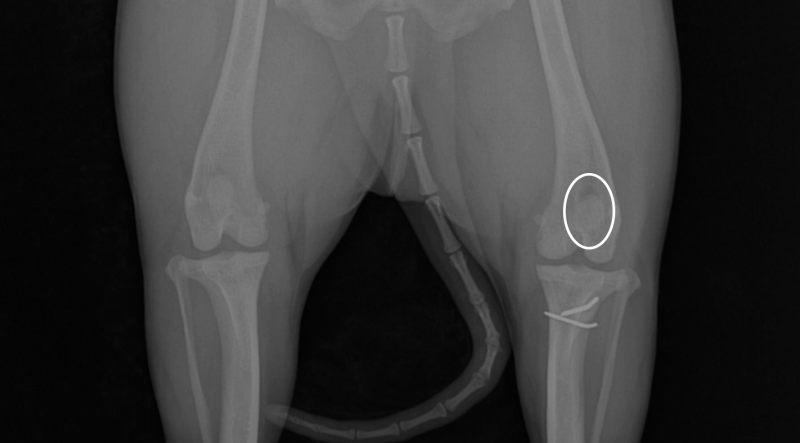 환자의 뒷다리 방사선 사진 / 환자의 왼쪽 다리 세부 사진