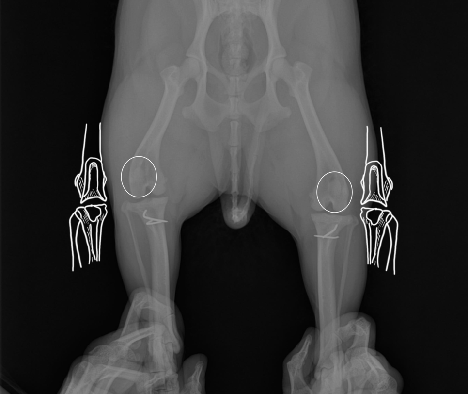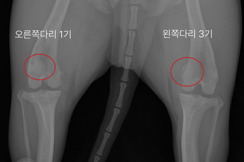 환자의 방사선 사진입니다. 오른쪽 다리는 1기, 왼쪽 다리는 슬개골 탈구 3기 진단을 받았습니다.