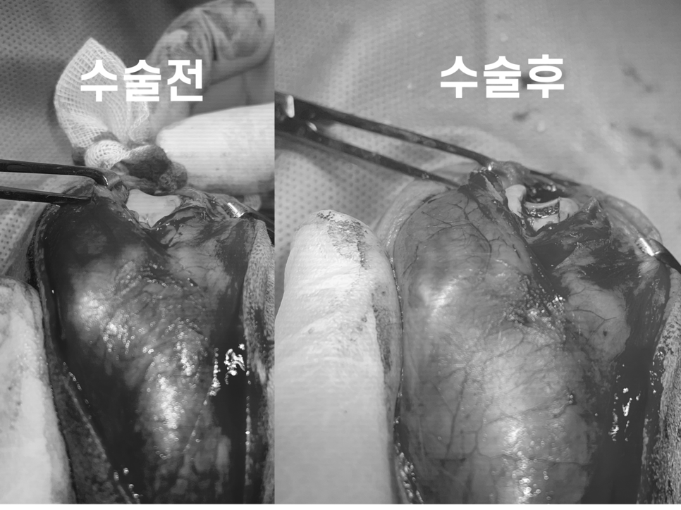 수술 직 후, 내측으로 빠져있던 슬개골이 정상 위치로 돌아온 것이 확인됩니다.